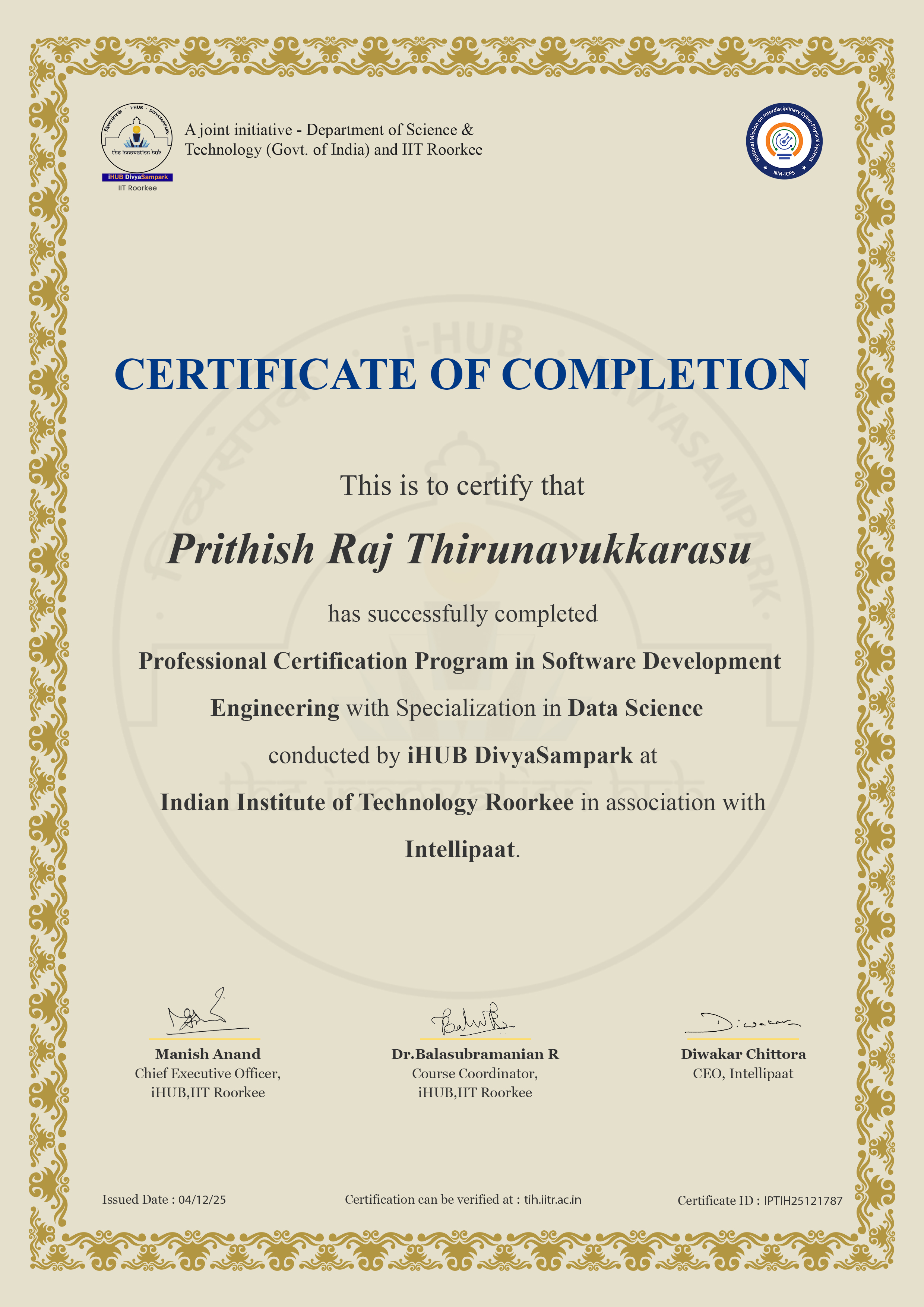 Hello! I'm Prithish, an aspiring software engineer driven by the fascinating interplay of data, design, and effective problem-solving. My academic journey is a unique blend: I'm currently pursuing a Bachelor of Arts in English, which enriches my analytical perspective, while simultaneously immersing myself in the technical realm through a Professional Certification in Software Engineering with a Data Science specialization.